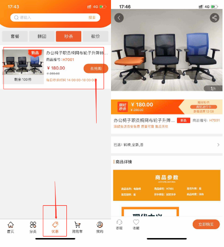 03点击【优惠】进入秒杀栏目,看到这款电脑椅了吗?家用办公都能用,超低价,不要犹豫,赶紧抢购!